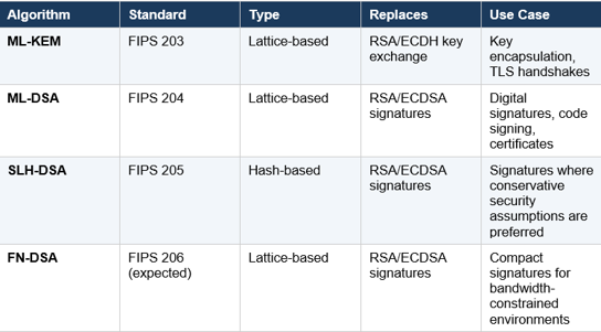 NIST’s standardisation process has produced the following approved algorithms. These are the replacements for RSA, ECC, and Diffie-Hellman that your organisation will need to adopt.